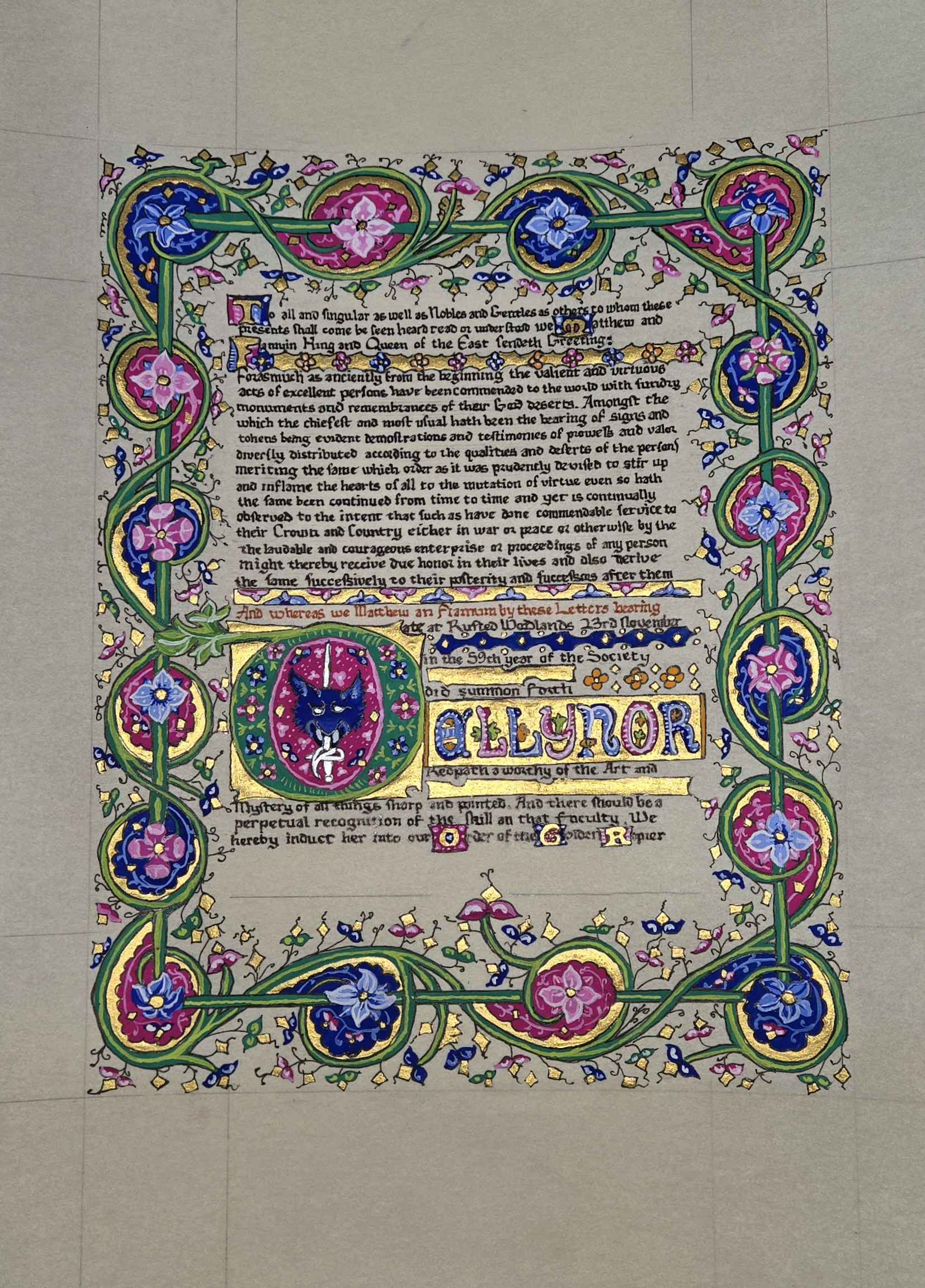 To all and singular as well Nobles and Gentles as others to whom these presents shall come, be seen, heard, read, or understood, we, Matthew and Fiamuin, King and Queen of the East, sendeth Greeting: